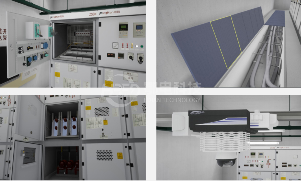 系統(tǒng)對開閉所區(qū)域進行三維全景仿真,并對關鍵設備,如銅排測溫,下水道濕度監(jiān)控,進行數據可視化三維模擬,另外根據巡檢機器人現(xiàn)場情況進行實時三維模擬,達到人不在現(xiàn)場,卻如到達現(xiàn)場的效果,高效的進行智能巡檢工作。
